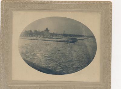 Labeled The wood piers, stones in the cribs. Narrow board walk. |